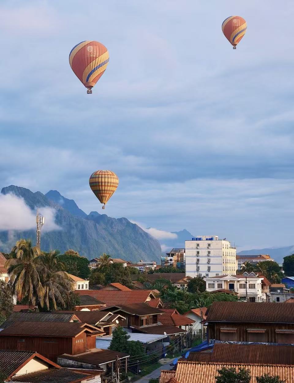 In the early morning of Vang Vieng, soft mist and warm sunlight embrace the land. Hot air balloons rise gently above karst mountains and the winding Nam Song River, revealing a breathtaking panorama below. Golden light flows across the green valleys, creating a peaceful and majestic scene. Floating in the sky, time seems to slow down, offering a moment of freedom, romance, and unforgettable natural beauty.